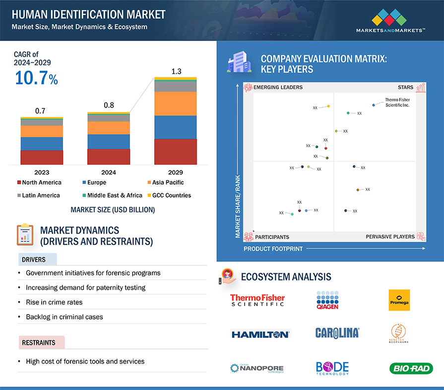 매출 기준 전 세계 인간 식별 시장의 규모는 2024년 0.8억 달러로 추정되며 2024년부터 2029년까지 10.7%의 연평균 성장률로 성장하여 2029년에는 13억 달러에 달할 것으로 전망됩니다. 새로운 연구 조사는 시장의 산업 동향 분석으로 구성됩니다. 새로운 연구는 산업 동향, 가격 분석, 특허 분석, 컨퍼런스 및 웨비나 자료, 주요 이해 관계자, 시장 내 구매 행동으로 구성됩니다.