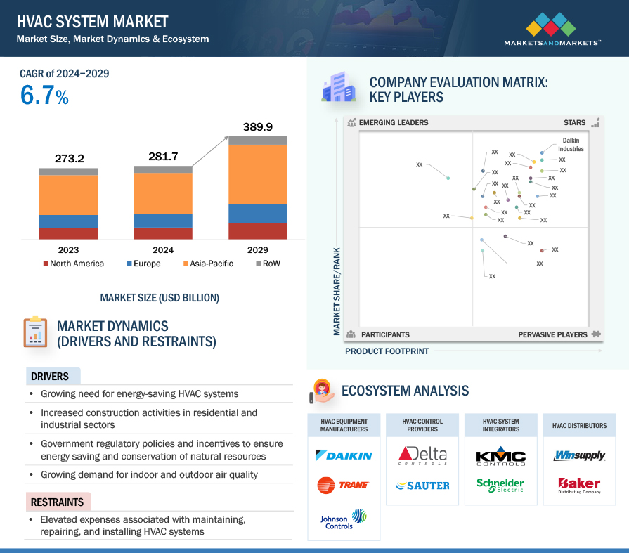 전 세계 HVAC 시스템 시장 규모는 2024년 2,817억 달러로 예상되며 2029년에는 3,899억 달러에 달하고 예측 기간 동안 6.7%의 연평균 성장률로 성장할 것으로 전망됩니다.
