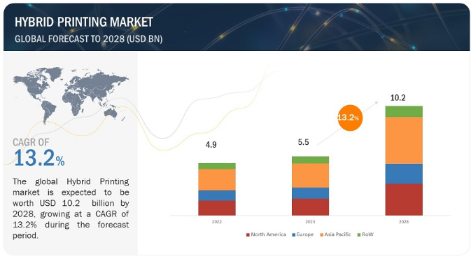 전 세계 하이브리드 인쇄 시장 규모는 2023년 55억 달러로 평가되었으며 2028년에는 102억 달러에 달할 것으로 예상되며 예측 기간 동안 13.2%의 연평균 성장률(CAGR)로 성장할 것으로 전망됩니다. 이 시장의 성장은 단기 인쇄에 대한 수요 증가, 포장 및 라벨링 애플리케이션에서 고품질 인쇄의 확산, 개인화된 인쇄 재료의 채택 증가에 의해 주도되고 있습니다.