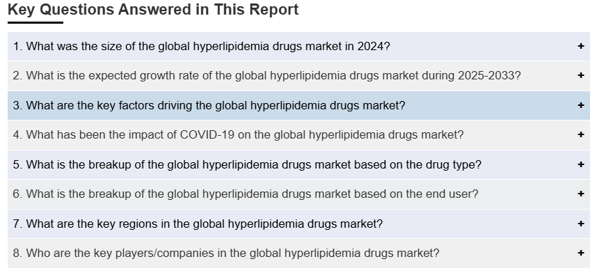 전 세계적으로 고지혈증의 유병률이 증가하는 것은 시장의 성장을 이끄는 주요 요인 중 하나입니다. 또한, 높은 수준의 콜레스테롤과 심혈관 질환에 더 취약한 노인 인구의 증가도 시장 성장을 주도하고 있습니다. 이에 따라 대중의 건강 의식이 높아지고 고 콜레스테롤 혈증에 대한 사용 가능한 치료 대안에 대한 인식이 높아지면서 시장 성장에 유리하게 작용하고 있습니다. 또한 효능이 향상된 신약 개발과 같은 다양한 기술 발전도 다른 성장 유도 요인으로 작용하고 있습니다. 이러한 약물은 죽상 경화성 플라크의 내피 기능과 안정성을 개선하고 세포에 염증과 손상을 최소화합니다. 전 세계 의료 인프라의 전반적인 개선과 함께 생의학 분야의 광범위한 연구 개발(R&D) 활동을 포함한 기타 요인이 시장을 더욱 견인할 것으로 예상됩니다.