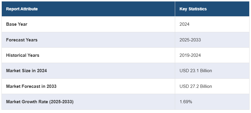 2024년 글로벌 고지혈증 치료제 시장 규모는 231억 달러에 달했습니다. IMARC 그룹은 2033년까지 시장이 272억 달러에 달할 것으로 예상하며, 2025~2033년 동안 1.69%의 성장률(CAGR)을 보일 것으로 전망합니다.