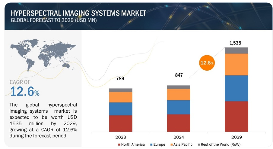 글로벌 초분광 이미징 시스템 시장 규모는 2024년 8억 4,700만 달러에 달할 것으로 예상되며 2024년부터 2029년까지 12.6%의 CAGR로 성장하여 2029년에는 15억 3,500만 달러에 달할 것으로 전망됩니다.