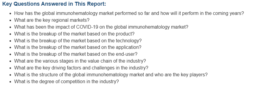 면역혈액학은 면역계와 관련하여 혈액과 혈액 형성 조직을 연구하는 의학 분야의 한 분야를 말합니다. 혈액 내 항원의 존재와 용혈 또는 적혈구(RBC) 응집을 유발할 수 있는 항체와의 반응을 연구하는 데 사용됩니다. 안전한 수혈을 보장하고, 원치 않는 면역, 이식, 임신 관련 반응을 예방하고, HIV, 간염 등과 같은 혈액 관련 장애와 질병을 진단하기 위해 다양한 면역혈액학 검사가 실시됩니다. 이 검사는 시약과 같은 다양한 화학 물질과 장치, 마이크로플레이트, 바이오칩, 겔 카드, 중합효소연쇄반응, 적혈구 자화 기술(EMT) 등의 기술을 기반으로 하는 자동 및 반자동 분석기를 활용합니다.
