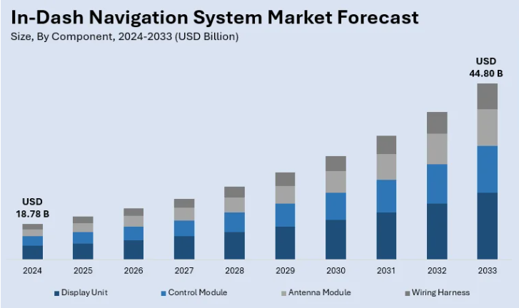 개발도상국에서 차량 생산이 증가함에 따라 대시보드 내비게이션 시스템도 수요가 증가하고 있습니다. 도로에서의 주행 경험과 안전을 향상시키기 위해 자동차 제조업체는 첨단 자동차에 인포테인먼트 및 내비게이션 솔루션을 도입하고 있습니다. 또한 인공지능(AI) 기반의 매핑, 실시간 교통 정보, 경로 계획은 이러한 대시보드 시스템의 기능을 더욱 향상시키고 있습니다. 최적화된 충전소 위치를 제공하는 대시보드 내비게이션에 대한 수요가 증가함에 따라 전기 자동차의 채택이 증가하고 있습니다. 각국 정부는 더 나은 도로 관리 및 긴급 지원을 위해 내장형 내비게이션을 의무화하는 규정을 도입합니다. 5G 연결의 보급이 확대되면서 원활한 실시간 업데이트와 클라우드 기반 매핑을 보장하는 시스템 기능이 더욱 향상됩니다. 자율주행 및 커넥티드 차량을 포함한 스마트 모빌리티의 추세에 따라 제조업체는 차량 인텔리전스 향상을 위한 핵심 구성 요소로 대시보드 내비게이션 시스템에 집중하고 있습니다. 예를 들어, BMW는 2025년 1월에 기존의 게이지 클러스터를 없애고 내비게이션과 운전자 지원을 위한 증강 현실을 통합한 3D 헤드업 디스플레이를 앞유리에 장착한 파노라믹 iDrive를 공개했습니다. 또한 소프트웨어와 하드웨어의 지속적인 발전으로 시장 기회가 더욱 확대되고 있습니다.