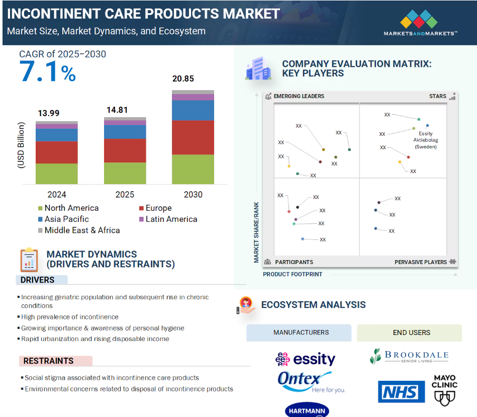 전 세계 요실금 관리 제품 시장은 2024년 US$13.99억 달러로 평가되었으며, 2025년에는 US$14.81억 달러로 성장했으며, 2025년부터 2030년까지 7.1%의 견고한 연평균 성장률(CAGR)로 성장해 기간 종료 시 US$20.85억 달러에 달할 것으로 예상됩니다. 의료 서비스 제공 모델의 변화로 가정 기반 및 장기 요양 서비스가 우선시되면서 ICP 시장이 성장하고 있습니다. 특히 신흥 시장에서 가처분 소득이 증가하면서 개인 위생 및 의료 제품에 대한 구매력이 향상되고 지출이 증가했습니다. 많은 국가에서 보험 적용 범위와 간병인 지원 프로그램이 확대되면서 가정 의료 서비스에 대한 수요가 증가하고 있습니다. 또한, 바이오 기반의 초흡수성 폴리머가 개발되고 스마트 기저귀가 점점 더 많이 채택되면서 이 분야의 기업들에게 새로운 기회가 생기고 있습니다.