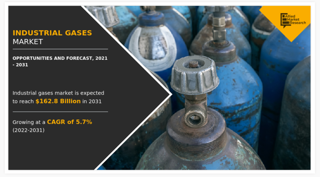 2021년 세계 산업용 가스 시장 규모는 938억 달러로 추정되었으며, 산업용 가스 산업은 2031년까지 1,628억 달러에 이를 것으로 예상되며, 2022년부터 2031년까지 연평균 5.7%의 성장률을 보일 것으로 예상됩니다.