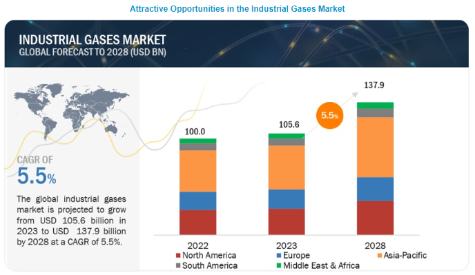 전 세계 산업용 가스 시장은 2023년 1,056억 달러 규모로 2023년부터 2028년까지 연평균 5.5% 성장하여 2028년에는 1,379억 달러에 달할 것으로 예상됩니다. 질소, 수소, 산소를 포함한 산업용 가스는 다양한 화학물질과 비료 제조에 필수적이며 합성, 정제, 연소 등의 공정에서 핵심적인 역할을 합니다. 전 세계 인구 증가와 도시화로 인해 다양한 산업에서 화학 물질에 대한 수요가 증가하고 농업이 증가하는 인구를 먹여 살려야 하는 과제에 직면함에 따라 산업용 가스의 다양한 응용 분야는 화학 생산과 농업 생산성 향상에 필수적인 기여자로 자리매김하고 있습니다. 이러한 공생 관계는 산업용 가스가 세계 경제 발전과 지속 가능성에 필수적인 주요 부문을 지원하는 데 있어 중요한 역할을 하고 있음을 강조합니다. 아시아 태평양 지역은 산업용 가스의 가장 큰 시장이며 북미와 유럽이 그 뒤를 잇고 있습니다.
