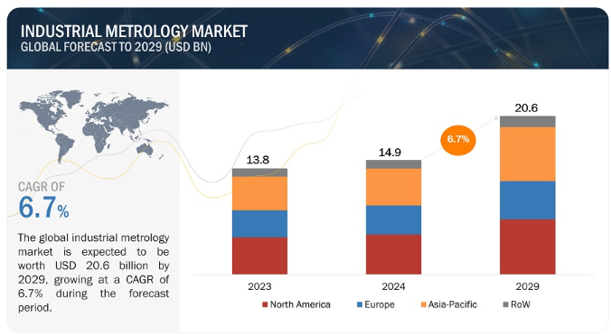 산업용 계측 시장은 2024년 149억 달러에서 2029년 206억 달러에 달할 것으로 예상되며, 2024년부터 2029년까지 6.7%의 연평균 성장률(CAGR)로 성장할 것으로 전망됩니다. 자동차, 항공우주, 방위, 제조 등 여러 분야에서 산업 계측에 대한 수요가 증가하는 것이 이러한 성장에 중요한 촉매제가 되고 있습니다. 또한 산업용 계측 시스템 및 전기 자동차의 도입과 함께 높은 신뢰성과 품질 프로세스에 대한 요구가 증가하면서 시장 확대에 박차를 가하고 있습니다. 또한 식품 산업에서의 산업 계측 솔루션 도입, 계측 데이터 관리를 위한 클라우드 서비스 통합, 인더스트리 5.0의 등장도 시장 성장을 이끄는 요인으로 작용하고 있습니다.