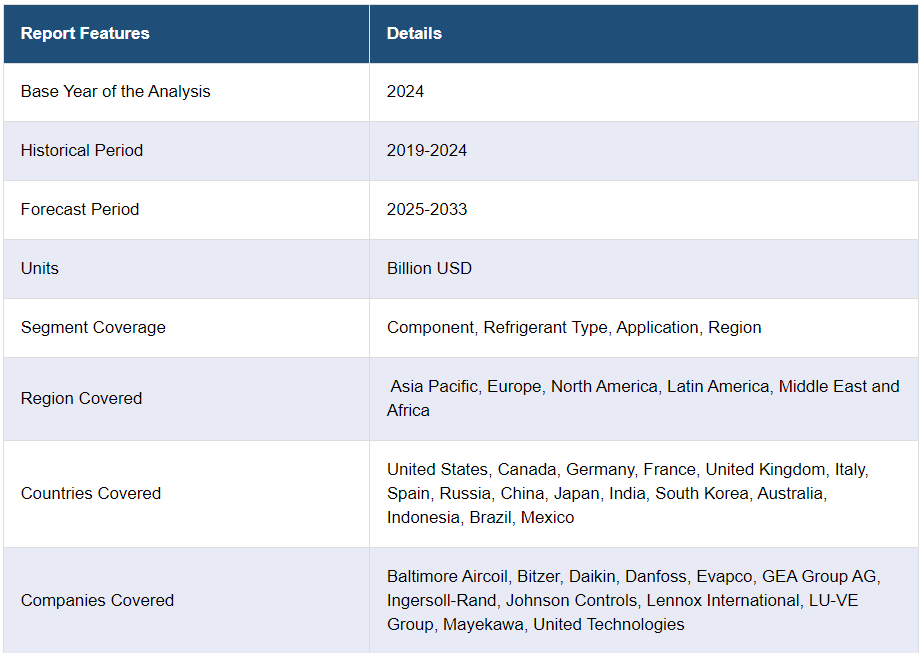 IMARC 그룹은 2025-2033년 글로벌, 지역 및 국가 수준에서의 예측과 함께 글로벌 산업용 냉동 시스템 시장 보고서의 각 하위 세그먼트의 주요 동향에 대한 분석을 제공합니다. 이 보고서는 구성 요소, 냉매 유형 및 응용 분야를 기준으로 시장을 분류했습니다.