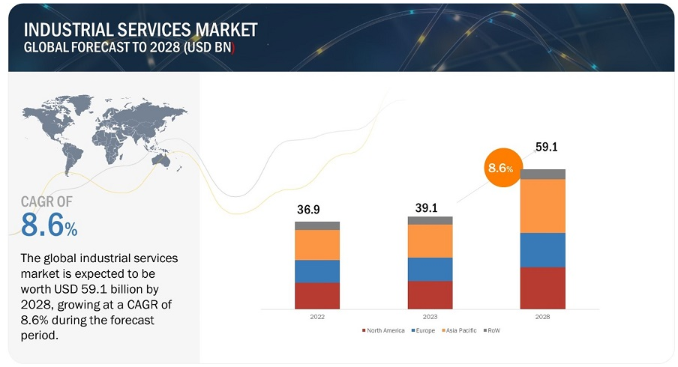 글로벌 산업 서비스 시장은 2023년 391억 달러 규모로 2028년에는 591억 달러에 달할 것으로 예상되며, 2023년부터 2028년까지 8.6%의 연평균 성장률(CAGR)을 보일 것으로 전망됩니다. 산업계는 효율성과 경쟁력을 강화하기 위해 디지털 트랜스포메이션을 진행하고 있습니다. 설치부터 폐기에 이르기까지 종합적인 자산 관리의 중요성에 대한 인식이 높아지면서 라이프사이클 서비스에 대한 수요가 증가하고 있습니다. 산업 서비스는 디지털 트윈 구현, 예측 유지보수, 스마트 제조 등 라이프사이클 서비스 디지털 이니셔티브를 지원합니다.