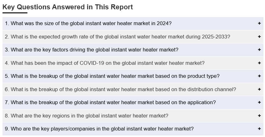 IMARC 그룹은 2025-2033년 기간 동안의 글로벌, 지역, 국가 수준에서의 예측과 함께, 글로벌 순간 온수기 시장 보고서의 각 하위 부문에서 주요 트렌드에 대한 분석을 제공합니다. 저희의 보고서는 제품 유형, 유통 채널, 그리고 응용 프로그램에 기초하여 시장을 분류했습니다.