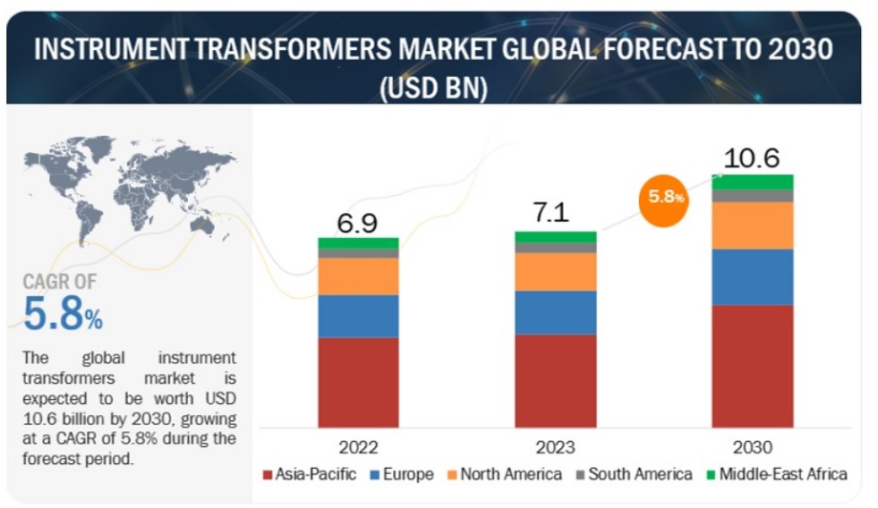 2023년 계기 변압기 시장은 71억 달러로 추정되며, 2030년까지 106억 달러로 성장하여 5.8%의 연평균 성장률(CAGR)을 보일 것으로 예상됩니다. 이 지역 내 기업의 증가로 에너지 소비가 증가함에 따라 효율적인 전력 사용을 위해 최신 계기 변압기의 사용이 필요해졌습니다. 급속한 도시화와 인프라 개발로 에너지 수요가 증가하면서 아시아 태평양 시장에서 계기 변압기에 대한 수요가 증가하고 있습니다. 아시아 태평양 지역의 전력 네트워크를 업데이트하려는 정부의 조치로 인해 효율적이고 신뢰할 수 있는 에너지 분배를 보장하는 계기 변압기에 대한 수요가 증가하고 있습니다.