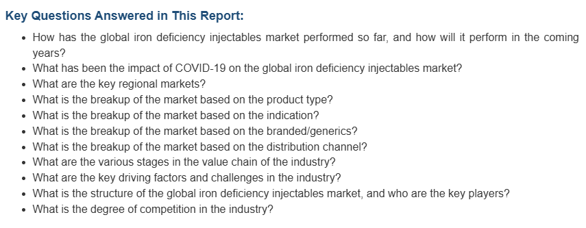 2024년 3월: Cadila Pharmaceuticals는 빈혈을 해결하기 위한 새로운 철분 주사를 출시했습니다. 이 주사는 모범적인 안전성 프로파일을 제공하며, 철분 결핍에 대한 효과적인 치료에 대한 증가하는 수요를 충족하는 것을 목표로 합니다.