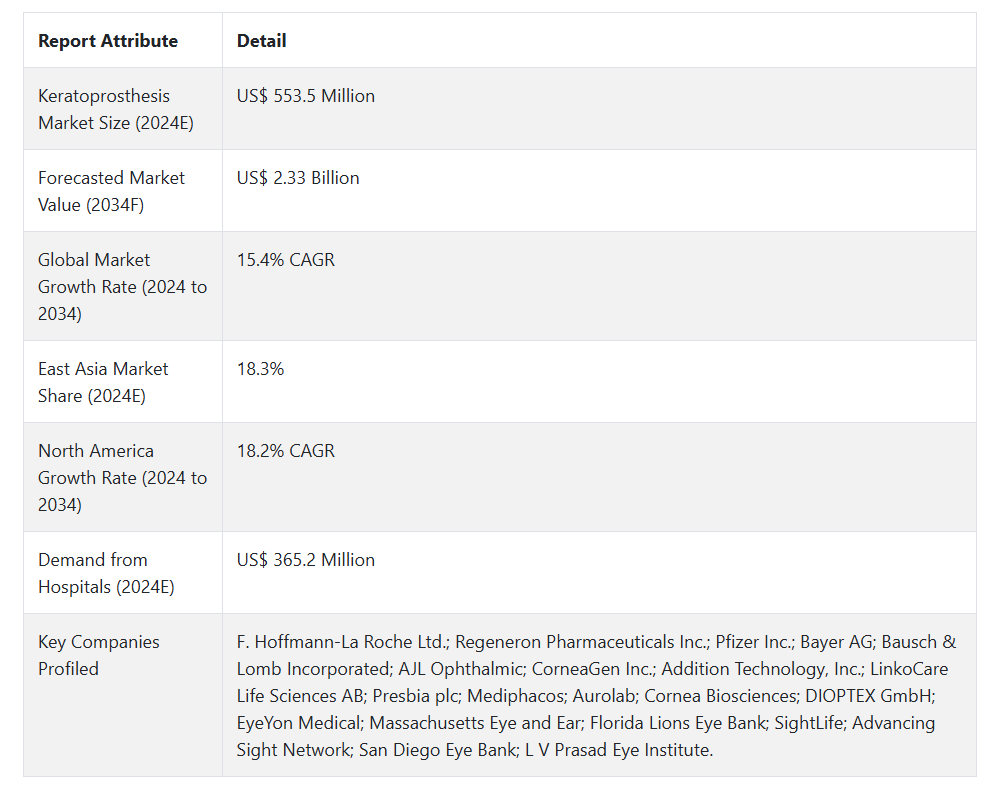 인공 각막 삽입물의 최근 발전은 이식 조직과 숙주 조직의 통합을 개선하는 데 초점을 맞추고 있으며, 생체 적합성 물질의 사용을 통해 장기적인 결과를 도모하는 연구가 진행되고 있습니다. 주요 기업들은 인공 각막 산업에서 경쟁력을 유지하기 위해 지속적으로 새로운 기술과 제품 개발에 집중하고 있습니다. 이러한 배경 속에서, 인공 각막 시장은 2034년까지 23억 3천만 달러를 초과할 것으로 예상되며, 연평균 성장률은 15.4%에 이를 것으로 전망되고 있습니다. 주요 기업으로는 F. Hoffmann-La Roche Ltd., Regeneron Pharmaceuticals Inc., Pfizer Inc. 등이 있습니다.