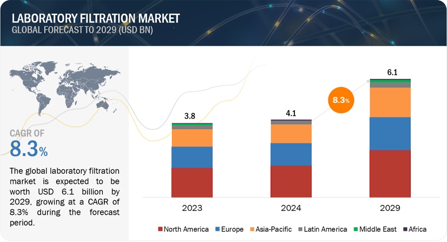 매출 기준 글로벌 실험실 여과 시장은 2024년에 41억 달러의 가치가 있는 것으로 추정되며 2024년부터 2029년까지 8.3%의 연평균 성장률로 성장하여 2029년에는 61억 달러에 달할 것으로 전망됩니다. 새로운 연구 조사는 시장의 산업 동향 분석으로 구성됩니다. 새로운 조사 연구는 산업 동향, 가격 분석, 특허 분석, 컨퍼런스 및 웨비나 자료, 주요 이해관계자, 시장의 구매 행동으로 구성되어 있습니다.