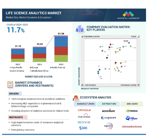 글로벌 생명과학 분석 시장은 예측 기간 동안 11.7%의 연평균 성장률로 2024년 356억 9,000만 달러에서 2029년에는 619억 4,000만 달러에 달할 것으로 예상됩니다. 다양한 데이터 세트(임상시험, 전자 건강 기록, 유전체학 및 실제 증거와 같은 소스에서 생성)의 표준화, 다양한 플랫폼 및 지역 간 정보 교환, 대량의 원시 데이터를 실행 가능한 인사이트로 활용하고 보고서를 간소화하며 대화형 대시보드를 만드는 AI, 양자 컴퓨팅 및 인지 컴퓨팅과 같은 기술의 등장, 전임상시험, 신약 개발 및 임상시험에서 분석 채택 증가는 생명과학 산업에서 분석 채택이 지속적으로 증가하는 데 기여하는 주요 요인 중 몇 가지를 들 수 있습니다.