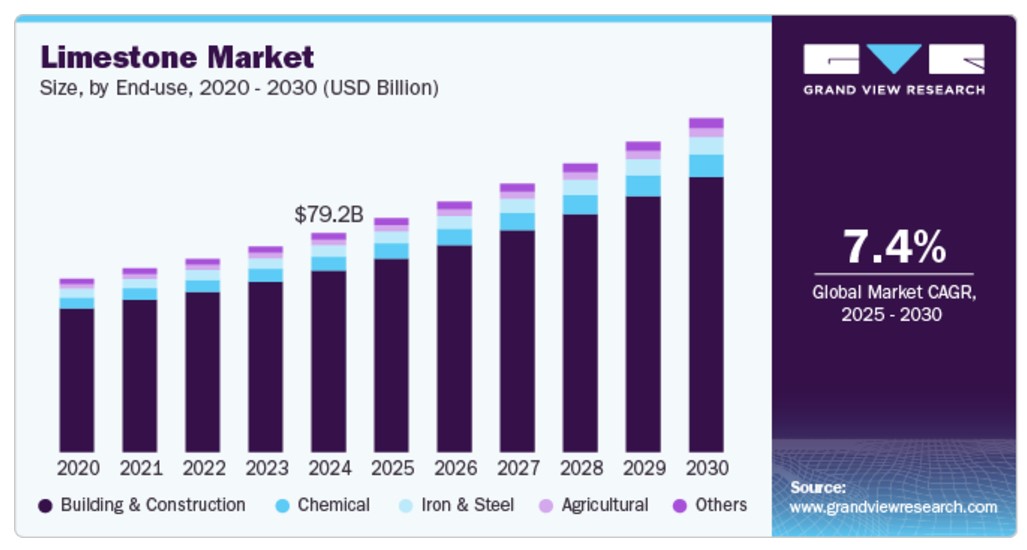 전 세계 석회석 시장 규모는 2024년 7918억 달러로 추정되며 2025년부터 2030년까지 7.4%의 연평균 성장률(CAGR)로 성장할 것으로 예상됩니다. 수처리 및 정화 활동에 대한 투자가 증가하면서 향후 몇 년간 석회석 수요를 촉진할 것으로 예상됩니다.