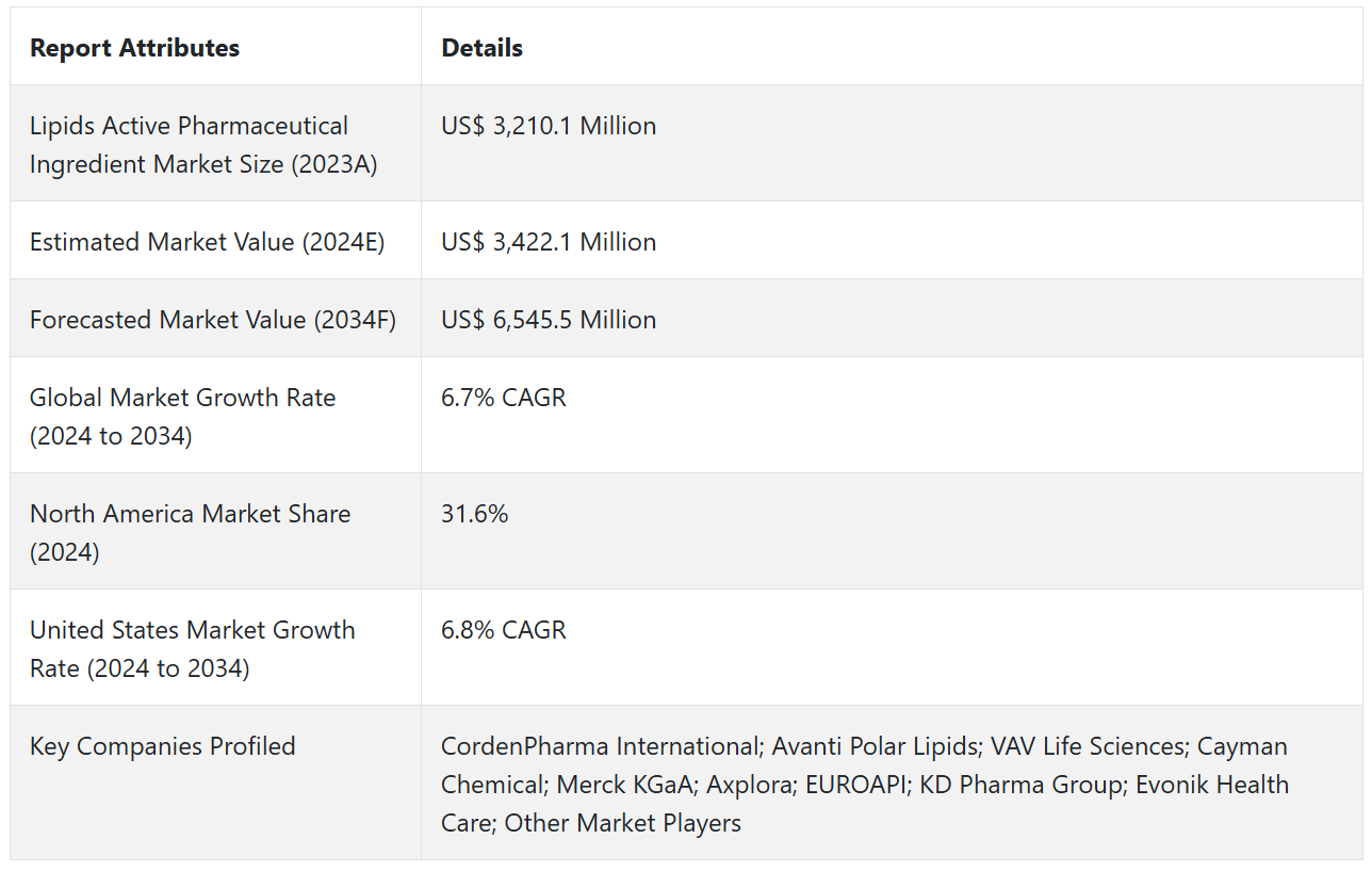 앞서 언급한 사실들을 바탕으로, 지질 활성 제약 성분 시장은 2024년부터 2034년까지 예측 기간 동안 연평균 성장률 6.7%로 성장할 것으로 예상됩니다.
