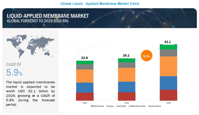 전 세계 액체 도포 멤브레인 시장 규모는 2024년 241억 달러에서 2029년 321억 달러에 달할 것으로 예상되며, 예측 기간 동안 5.9%의 CAGR을 기록할 것으로 전망됩니다. 액체 도포 멤브레인 시장은 향후 몇 년 동안 크게 성장할 것으로 예상됩니다. 액상 도포 멤브레인은 신뢰할 수 있고 오래 지속되는 내구성과 내후성을 제공하여 물 침투, 자외선 노출 및 기타 환경 요소에 대한 효과적인 차폐를 보장합니다. 원활한 적용, 적응성, 빠른 설치로 인해 기존 방수 기술보다 선호도가 높아 시장에서 널리 채택되고 있습니다.