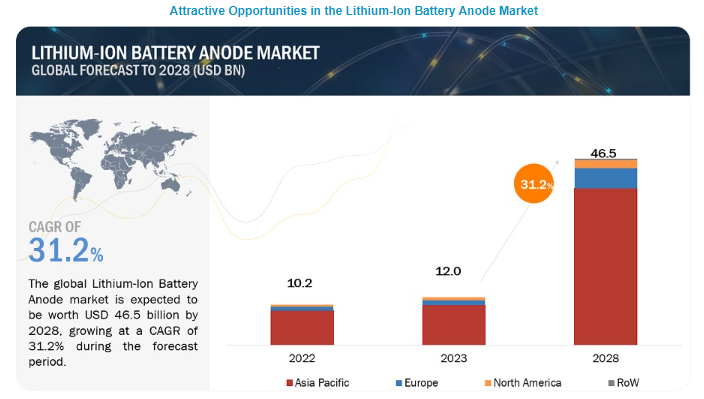 글로벌 리튬 이온 배터리 음극 시장은 2023년 120억 달러에서 2028년 465억 달러로 예측 기간 동안 31.2%의 연평균 성장률로 성장할 것으로 예상됩니다. 리튬 이온 배터리 음극 시장의 성장은 기술 발전, 전기 자동차 수요 증가, 재생 에너지 통합, 소비자 가전제품의 발전 등 다양한 요인에 의해 크게 영향을 받습니다. 이러한 성장은 효율적인 에너지 저장 솔루션에 대한 필요성 증가, 지속 가능한 에너지원으로의 전환을 촉진하는 환경 문제, 청정 에너지 채택을 장려하는 정부 이니셔티브에 의해 촉진되고 있습니다. 시장이 확대됨에 따라 주요 업체들은 배터리 성능을 향상하고 비용을 절감하며 다양한 산업 분야에서 증가하는 리튬 이온 배터리 수요를 충족하기 위해 혁신에 나서고 있습니다.