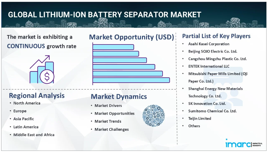 글로벌 시장은 특히 전기차와 재생 에너지 부문의 수요 증가로 인해 크게 성장하고 있습니다. 기업들은 생산 능력을 확장하고 있습니다. 새로운 공장이 건설되고 있으며, 증가하는 요구 사항을 충족하기 위해 기존 공장을 업그레이드하고 있습니다. 이와 함께 세라믹 코팅 및 다층 분리막을 포함하여 더 안전하고 효율적이며 비용 효율적인 배터리 분리막을 만들기 위한 R&D 투자가 가속화되면서 시장을 크게 뒷받침하고 있습니다. 또한 다양한 산업 및 규제 기관에서 부과하는 엄격한 안전 및 성능 표준을 충족하는 데 대한 관심이 높아지는 것도 시장에 긍정적인 영향을 미치고 있습니다. 환경에 대한 관심이 높아지면서 기업들은 사용되는 소재부터 제조 공정에 이르기까지 제품의 지속 가능성을 높이기 위해 노력하고 있습니다. 이 외에도 브랜드들은 가전제품과 자동차부터 산업 및 의료용 애플리케이션에 이르기까지 다양한 산업의 요구를 충족하기 위해 제품을 맞춤화하고 있습니다. 또한 주요 업체들은 교육 캠페인, 웨비나, 사고 리더십 기사 등을 통해 잠재 고객에게 첨단 분리막 기술의 이점을 알리고 있습니다.