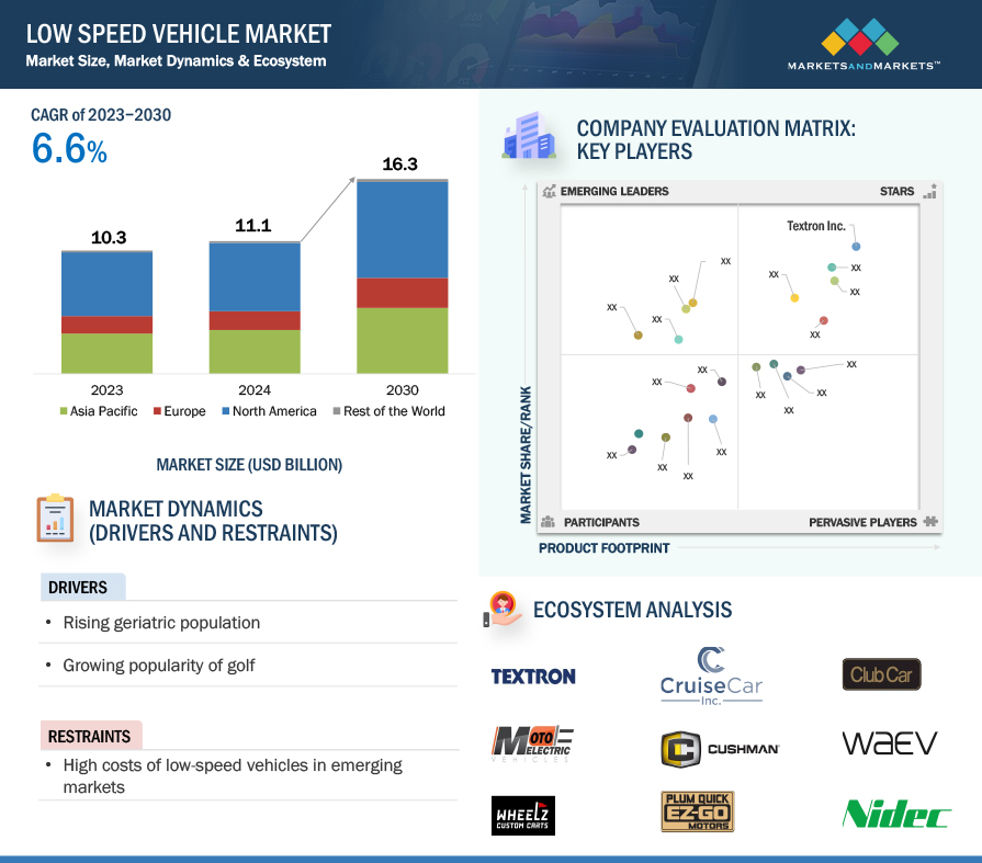 저속 차량 시장은 통합되어 있습니다. (미국), 야마하 모터(일본), 토로 컴퍼니(미국), 디어 앤 컴퍼니(미국), 웨이브(미국), 클럽카(미국) 등이 주요 기업입니다.