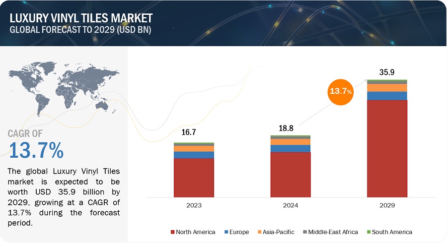 글로벌 고급 비닐 타일 시장은 2024년 188억 달러에서 2029년 359억 달러로 예측 기간 동안 13.7%의 CAGR로 성장할 것으로 예상됩니다. 다양한 지역에서 건설 산업의 급속한 확장이 시장 성장을 촉진할 것으로 예상됩니다. 주거 및 비주거 건설 증가, 리모델링 및 유지 보수 활동 증가, LVT의 높은 내구성 및 미적 매력 향상과 같은 요인이 LVT 시장에 대한 수요를 증가시킬 것으로 예상됩니다.