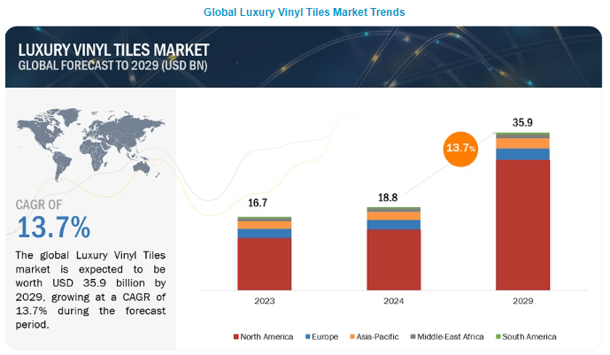 글로벌 고급 비닐 타일 시장은 2024년 188억 달러에서 2029년 359억 달러로 예측 기간 동안 13.7%의 CAGR로 성장할 것으로 예상됩니다. 다양한 지역에서 건설 산업의 급속한 확장이 시장 성장을 촉진할 것으로 예상됩니다. 주거 및 비주거 건설 증가, 리모델링 및 유지 보수 활동 증가, LVT의 높은 내구성 및 미적 매력 향상과 같은 요인이 LVT 시장에 대한 수요를 증가시킬 것으로 예상됩니다.