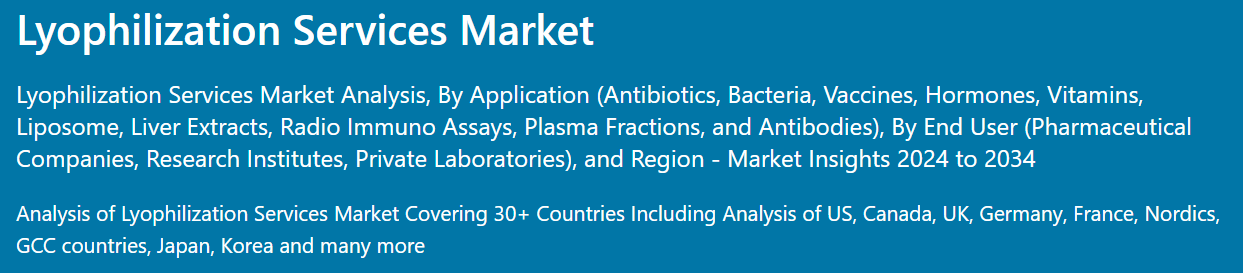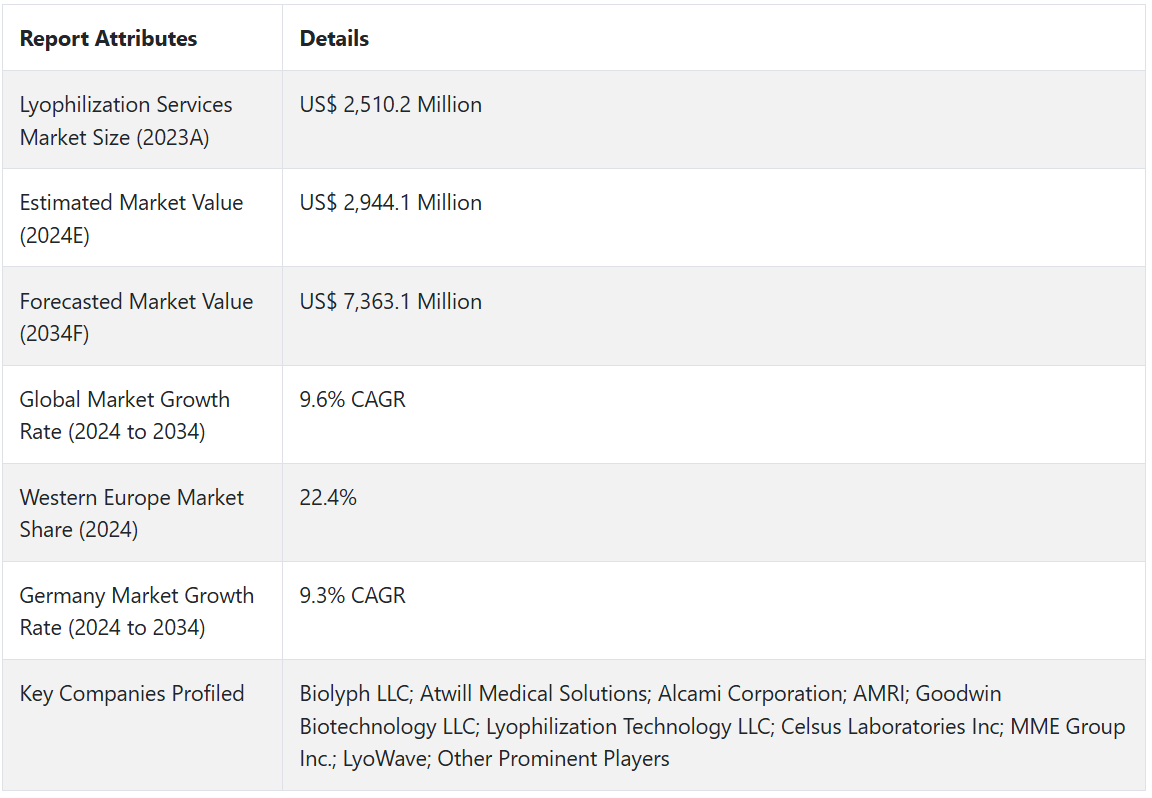 앞서 언급한 사실에 근거하여, 동결건조 서비스 시장은 2024년부터 2034년까지 예측 기간 동안 연평균 성장률 9.6%로 성장할 것으로 예상됩니다. 시장 조사 및 경쟁 정보 제공 업체인 Fact.MR에 따르면.