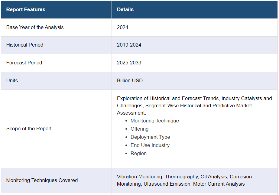 IMARC 그룹은 2025-2033년 글로벌, 지역 및 국가 수준의 예측과 함께 글로벌 기계 상태 모니터링 시장 보고서의 각 부문의 주요 동향에 대한 분석을 제공합니다. 이 보고서는 모니터링 기술, 오퍼링, 배포 유형 및 최종 사용 산업을 기준으로 시장을 분류했습니다.
