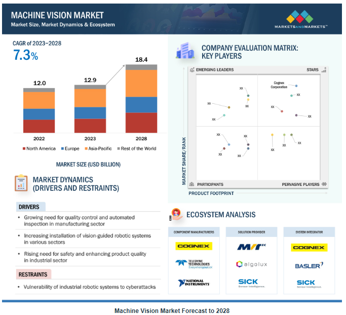 글로벌 머신 비전 시장 규모, 점유율, 산업 성장, 동향 및 분석은 2023년 129억 달러에서 2028년 184억 달러로 성장하여 7.3%의 CAGR을 기록할 것으로 전망됩니다. 머신 비전은 AI와 자동화의 발전에 힘입어 제조, 의료, 자동차 등의 분야에서 정밀도와 효율성을 향상시키며 산업 전반에 걸쳐 번창하고 있습니다. 시장 성장은 괄목할 만합니다.전체 보기