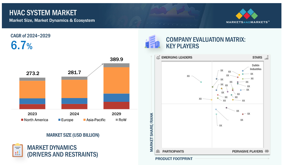 글로벌 HVAC 시스템 시장 규모는 2024년 2,817억 달러에 달할 것으로 예상되며 2029년에는 3,899억 달러에 달하고 2024년부터 2029년까지 6.7%의 연평균 성장률로 성장할 것으로 전망됩니다.