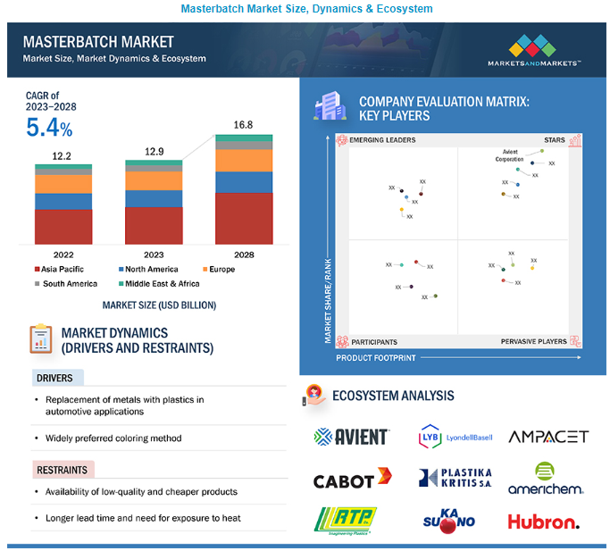 마스터배치 시장 규모는 2023년 129억 달러였으며 2028년에는 168억 달러에 달할 것으로 예상되며 예측 기간 동안 5.4%의 CAGR을 기록할 것으로 전망됩니다. 마스터배치의 유형은 컬러, 첨가제, 검정, 흰색, 필러 등이며 HDPE, PVC, PET, PP, LDPE 및 LLDPE, PS, PUR과 같은 폴리머에 사용됩니다. 마스터배치의 주요 응용 분야로는 건축 및 건설, 자동차, 소비재, 포장, 섬유, 농업 등이 있습니다. 유해 제품 사용에 대한 정부의 엄격한 규제는 마스터배치 시장의 플레이어들에게 도전으로 작용할 수 있습니다. 그러나 새롭고 혁신적인 기술을 사용하여 환경 위험의 영향을 줄이면 마스터배치 시장의 제조 업체에게 성장 기회를 제공할 수 있습니다. 플라스틱의 비생분해성이 시장에 영향을 미치고 있지만 신흥 경제국의 성장은 마스터배치 제조업체에게 엄청난 기회를 제공할 것으로 예상됩니다.