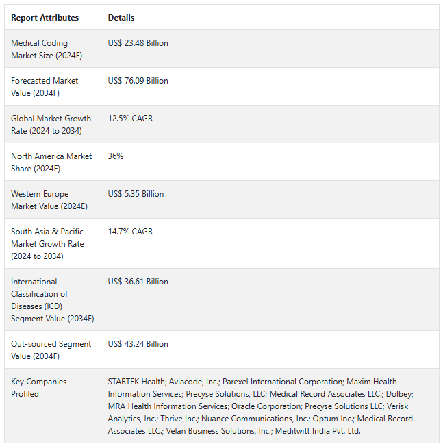 Fact.MR의 최신 연구에 따르면, 의료 코딩 시장은 2024-2034년 사이에 상당한 성장을 보일 것으로 예상됩니다. 의료 코딩은 항상 수요가 많았고, 예측 기간 동안 꾸준한 성장을 유지할 것으로 예상됩니다. 의료 코딩은 전자 건강 기록(EHR)을 지원하도록 설계되어 미국에서 수요가 많았습니다.