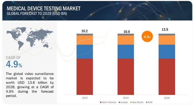전 세계 의료기기 테스트 시장 규모는 2023년 106억 달러로 2028년에는 135억 달러에 달할 것으로 예상되며, 2023년부터 2028년까지 4.9%의 연평균 성장률을 보일 것으로 전망됩니다. 글로벌 헬스케어 부문의 확장은 시장 이해관계자들에게 상당한 기회를 제공합니다. 특히 신흥 시장에서 의료 접근성이 개선되면서 인구 증가, 가처분 소득 증가, 건강 관리 및 웰빙에 대한 인식 제고 등의 요인으로 인해 첨단 의료 기기에 대한 수요가 증가하고 있습니다.