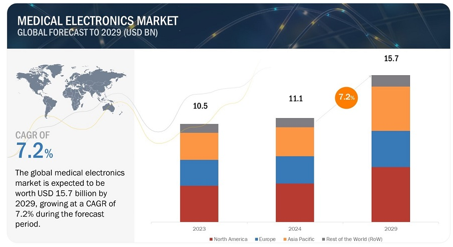 글로벌 의료 전자기기 시장은 2024년 111억 달러 규모로 2029년에는 157억 달러에 달할 것으로 예상되며, 2024년부터 2029년까지 7.2%의 연평균 성장률을 보일 것으로 전망됩니다. 글로벌 의료 전자 시장의 주요 동인은 다음과 같습니다. 의료 전자 시장의 성장을 촉진하는 의료비 지출의 증가. 또한 원격 의료의 인기가 높아짐에 따라 원격 의료 및 원격 모니터링 장치에 대한 수요가 크게 증가하고 있습니다. 그럼에도 불구하고 이 시장은 연결성 강화로 인한 사이버 보안 위협으로 인해 민감한 의료 정보와 장비에 위험을 초래하는 도전에 직면하고 있습니다.