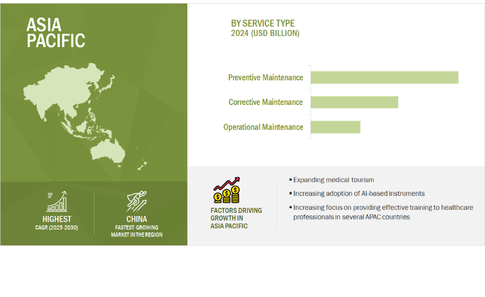 아시아 태평양 지역의 시장 성장은 의료 인프라의 확장과 함께 예방적 유지보수에 대한 관심이 높아짐에 따라 추진되고 있습니다. 유지보수 장비의 기술 발전도 예측 기간 동안 시장 성장을 촉진할 것으로 예상됩니다.