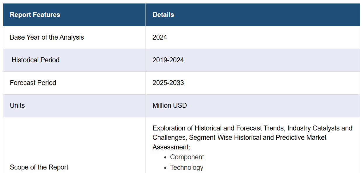 IMARC Group은 시장 각 부문의 주요 동향 분석과 함께 2025-2033년 국가별 전망을 제공합니다. 본 보고서는 구성 요소, 기술, 응용 분야, 산업 분야별로 시장을 분류했습니다.