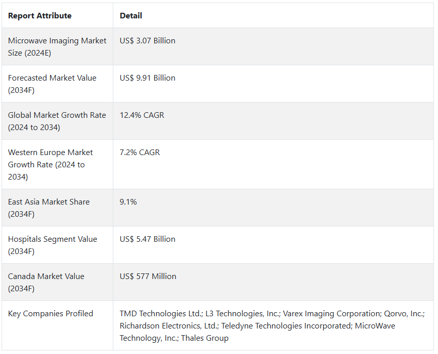 마이크로파 이미징 시장 수요에 따른 전 세계 매출은 2024년에 미화 30억 7천만 달러에 이를 것으로 추정되며, 연평균 성장률 12.4%로 증가하여 2034년에는 미화 99억 1천만 달러에 이를 것으로 예상됩니다.
