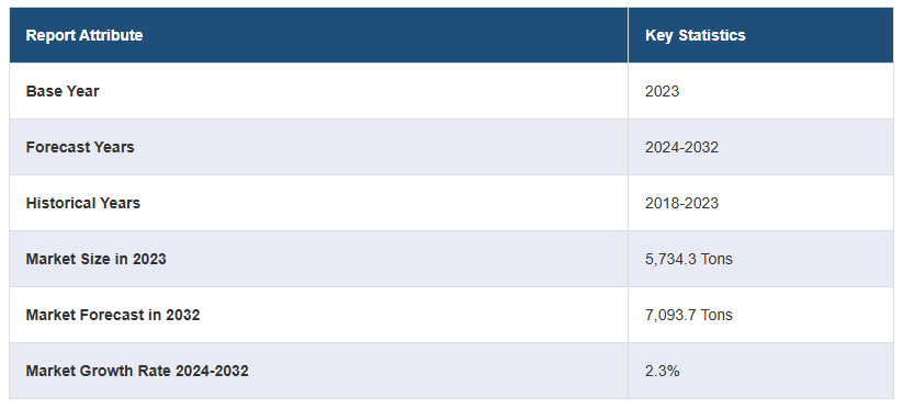 2023년 세계 몰리브덴 시장 규모는 5,734.3톤에 달했습니다. 앞으로 IMARC 그룹은 2024~2032년 동안 2.3%의 성장률(CAGR)을 보이며 2032년에는 7,093.7톤에 달할 것으로 예상하고 있습니다. 고강도 철강 및 초합금에 대한 수요 증가, 환경 배출을 줄이기 위한 재생 에너지에 대한 관심 증가, 인프라 및 건설 프로젝트의 증가가 시장을 추진하는 주요 요인 중 일부입니다.