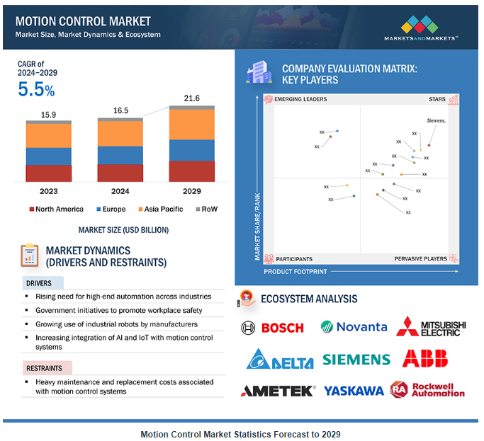 글로벌 모션 제어 시장 규모는 2024년 165억 달러에 달할 것으로 예상되며, 2029년에는 216억 달러에 달할 것으로 예상되어 예측 기간 동안 5.5%의 연평균 성장률(CAGR)로 성장할 것으로 전망됩니다.