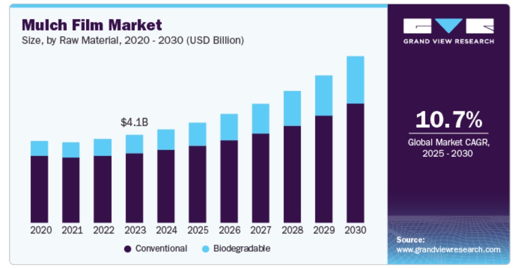 원자재에 따라 시장은 기존과 생분해성으로 구분됩니다. 2024년 기존 부문이 78.12%로 가장 큰 매출 비중을 차지했습니다. 기존의 멀치 필름은 새로운 생분해성 대체재에 비해 가격이 저렴하기 때문에 채택이 증가할 것으로 예상됩니다. 내구성이 뛰어나고, 오래 지속되며, 비용 효율적인 다중 문화 필름에 대한 수요 증가는 기존 멀치 필름 부문의 주요 동인입니다.