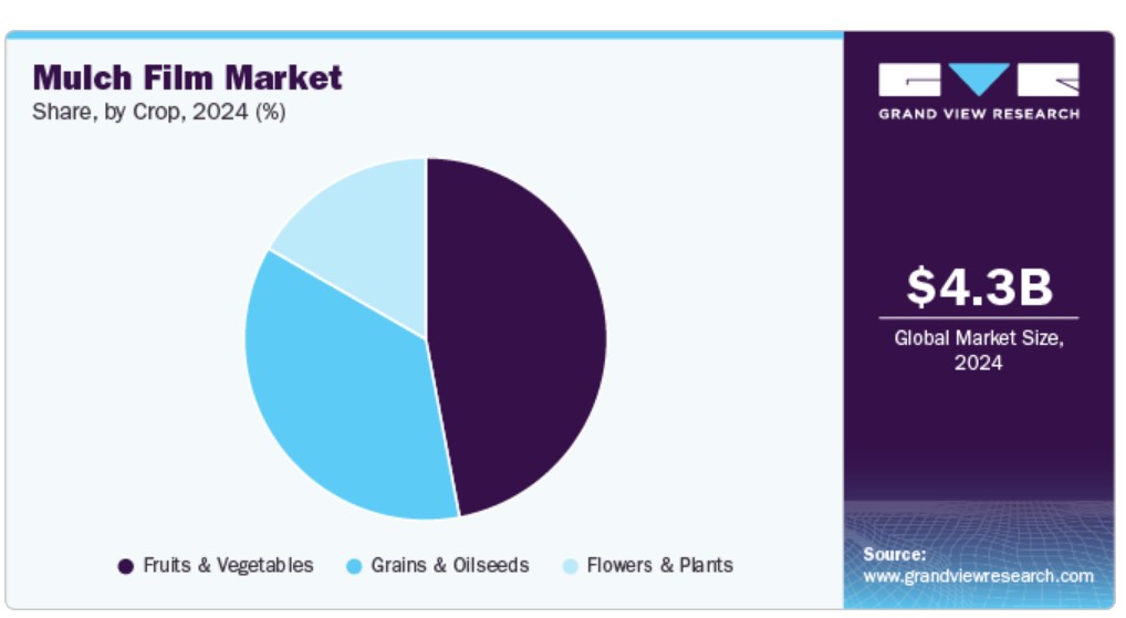 작물 유형에 따라 멀칭 필름 산업은 과일과 채소, 곡물과 유지 종자, 꽃과 식물로 세분화되었습니다. 과일 및 채소 부문은 2024년에 47.02%의 가장 큰 매출 점유율을 차지했습니다. 멀치 필름은 토양 온도를 조절하고, 수분 수준을 유지하며, 잡초의 성장을 억제함으로써 과일과 채소의 성장 조건을 개선하는 데 중요한 역할을 합니다. 이러한 장점 덕분에 농부들은 화학 물질을 적게 사용하면서도 더 건강한 작물을 생산할 수 있으며, 소비자의 자연적이고 안전한 식품에 대한 선호에 부합할 수 있습니다.