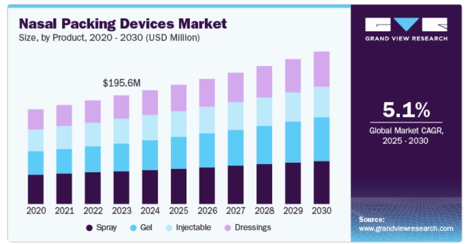 코 성형 및 코 수술 분야가 발전함에 따라 더 정교한 기술이 사용되고 있으며, 이로 인해 수술 후 관리에 대한 관심이 높아지고 있습니다. 출혈을 방지하고 합병증을 최소화하기 위해 효과적인 코 패킹이 필요한 최소 침습 수술에 대한 수요가 증가하는 것도 시장에 영향을 미치고 있습니다. 삽입이 쉽고 환자의 불편함을 줄이며 회복을 촉진하는 장치가 점점 더 많이 요구되고 있습니다.