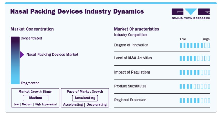 이 산업은 중간 정도의 산업 집중도를 특징으로 하며, Medtronic, Smith & Nephew, Medi-Tech와 같은 회사를 포함하여 소수의 주요 업체가 시장을 지배하고 있습니다. 이 장치는 주로 이비인후과 수술, 외상 치료, 비출혈(코피) 및 만성 부비동염과 같은 상태를 관리하는 데 사용됩니다. 이 업계는 흡수성 재료, 비침습적 디자인, 사용하기 쉬운 시스템 등 환자 친화적인 혁신적인 솔루션에 초점을 맞추고 있습니다. 최소 침습적 시술에 대한 수요 증가와 생분해성 재료의 발전은 혁신을 주도하고 있지만, 규제 준수 및 비용 압박은 여전히 지속적인 과제입니다.