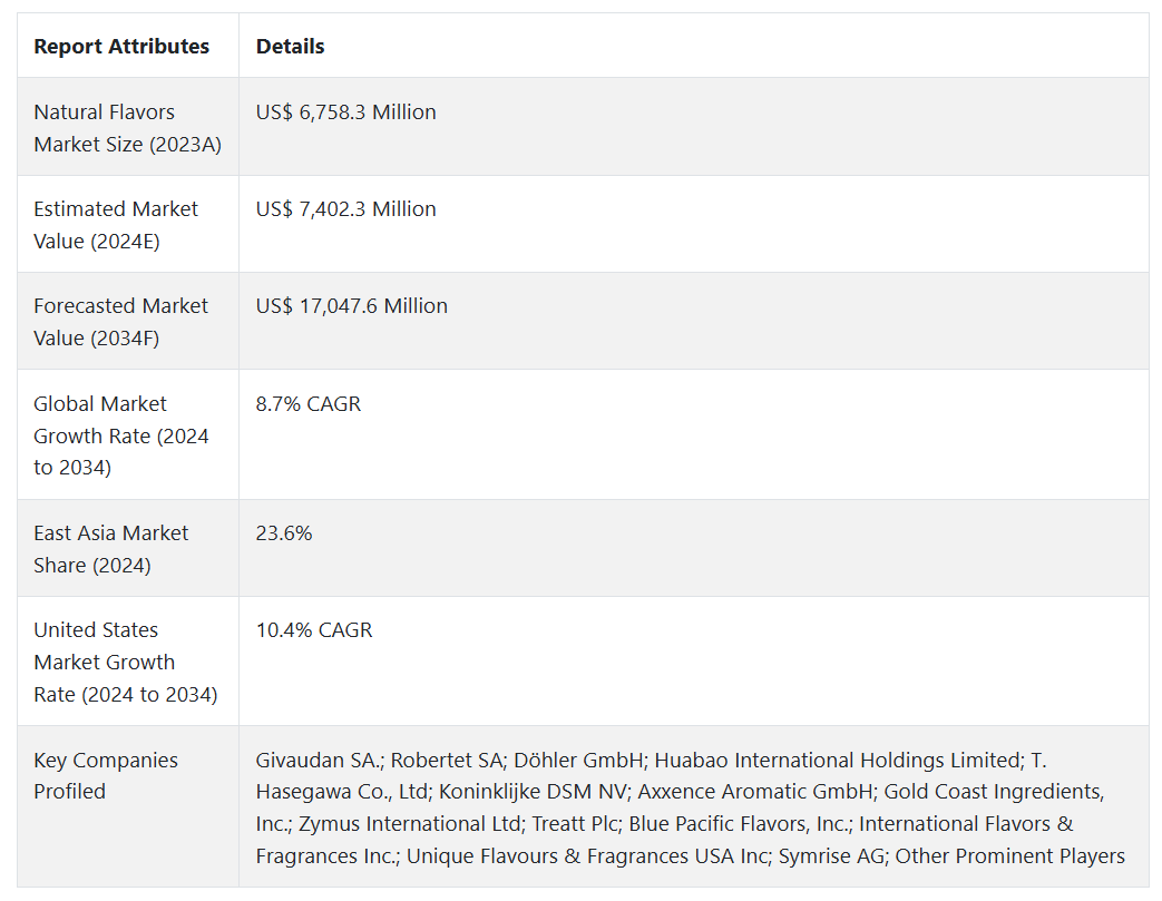 앞서 언급한 사실들을 바탕으로, 시장 조사 및 경쟁 정보 제공 업체인 Fact.MR에 따르면, 천연 향료 시장은 2024년부터 2034년까지 예측 기간 동안 연평균 8.7%의 성장률을 보일 것으로 예상됩니다.
