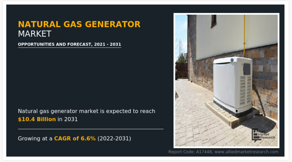 2021년 전 세계 천연가스 발전기 시장 규모는 55억 달러로 추정되었으며, 2031년에는 104억 달러에 이를 것으로 예상되며, 2022년부터 2031년까지 연평균 성장률(CAGR) 6.6%로 성장할 것으로 전망됩니다.
