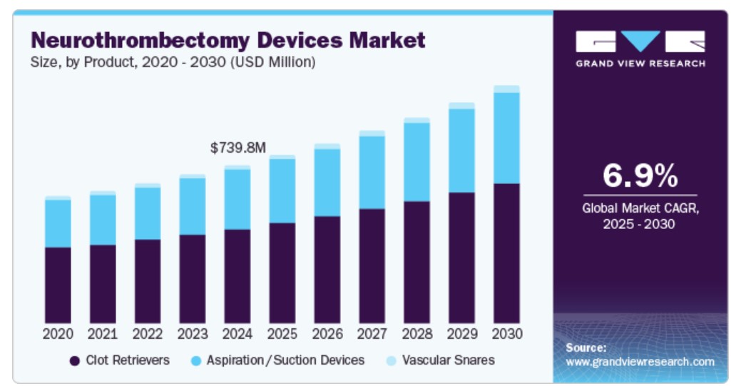 글로벌 신경혈전제거술 장치 시장 규모는 2024년에 미화 7억 3,981만 달러로 추정되었으며, 2025년부터 2030년까지 연평균 성장률 6.94%로 성장할 것으로 예상됩니다. 급성 허혈성 뇌졸중 발병률의 증가가 이 시장의 주요 원동력입니다. 또한, 건강에 좋지 않은 생활 방식의 채택이 증가하고 인구 사이에서 이 질환에 대한 인식이 높아짐에 따라 신경혈전제거술 기기 시장이 활성화되고 있습니다. 신경혈전제거술 기기는 노인에게 흔히 발생하는 허혈성 뇌졸중 치료에 매우 중요합니다. 현대인의 생활 방식, 스트레스, 식습관이 40세 이상의 성인에게 뇌졸중 위험을 초래하는 것으로 관찰되었습니다.