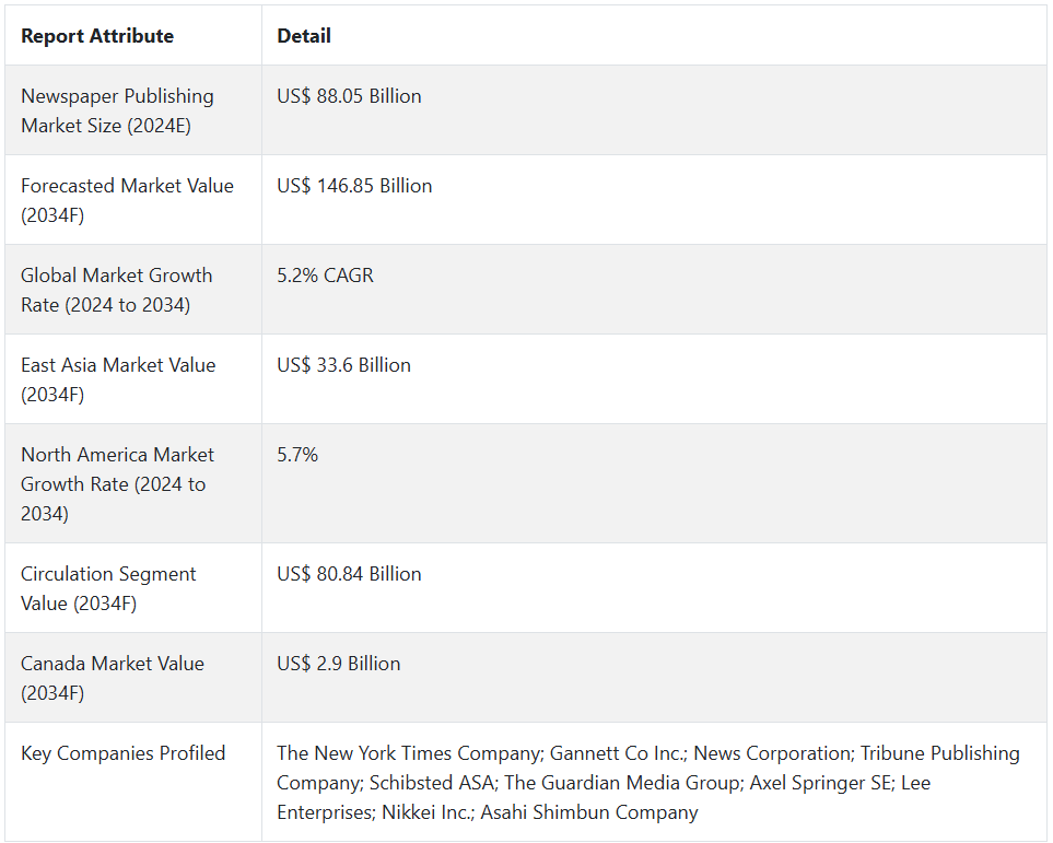 신문 출판 시장은 2024년부터 2034년까지 연평균 5.2%의 성장률을 보일 것으로 예상됩니다.