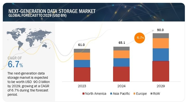차세대 데이터 스토리지 시장은 2024년 651억 달러로 평가되었으며 2029년에는 900억 달러에 달할 것으로 예상되며, 예측 기간 동안 6.7%의 연평균 성장률을 기록할 것으로 전망됩니다.